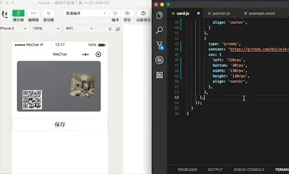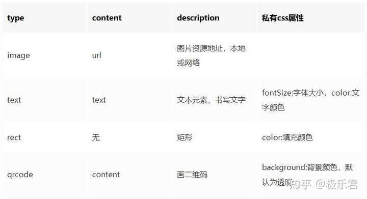 通过右边的类似于css又有点像json但其实上它是个js的寥寥几行代码,我们绘制出了左边的这样的图形,包含了背景图片、文字、图片、二维码这四种常用的元素。