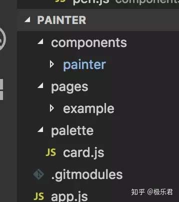 clone完成后可以看到目录。其中,/pages/example中存放的是使用示例,/components/painter就是我们所引入的功能组件。此外还有一个palette目录,里面存放是我们所需要绘图代码。实际工作时,painter会调取card.js里的信息,在图片上绘制出相应的图形,就像一支画笔在调色板上调制蘸取了颜料,然后在画布上创作一样。