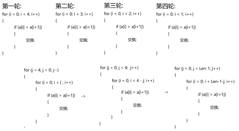 【c】冒泡排序 一个文艺有理想的程序 2018-07-11 125 阅读1分钟 for (j = 0; j < Len-1; j++) { for (i = 0; i < Len-1-j; i++) { if (a[i] > a[i+1]) { Tmp = a[i]; a[i] = a[i+1]; a[i+1] = Tmp; } } } 冒泡排序:两两按照顺序比较,第一轮找到最大值放在最后,第二轮找到剩下的最大值,放在倒数第二,依次类推即可。