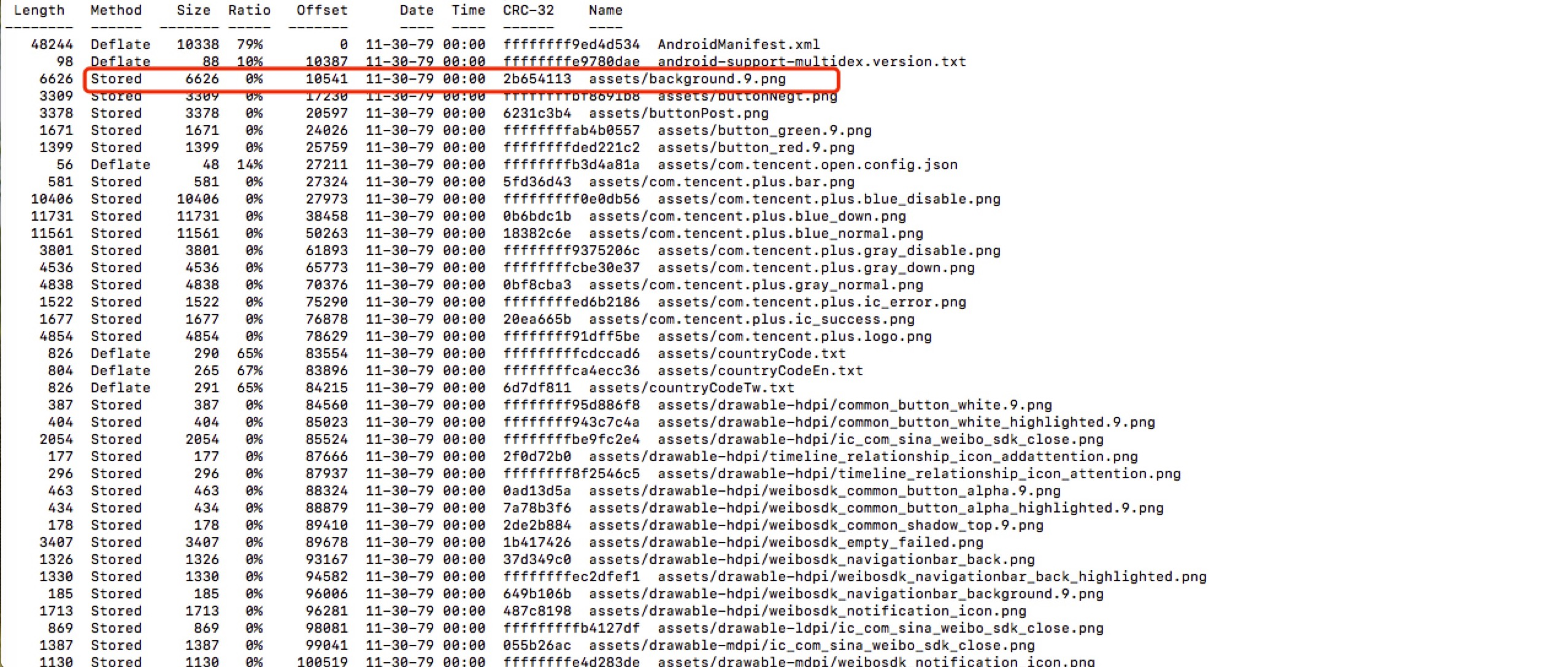 aapt l -v xxx.apk指令来,未经过7z压缩的apk,上述几种图片格式的文件对应的Method都是以Stored来存储的,根据Zip的文件格式中对压缩方式的描述Compression_methods可以看出这些文件是没有压缩的。