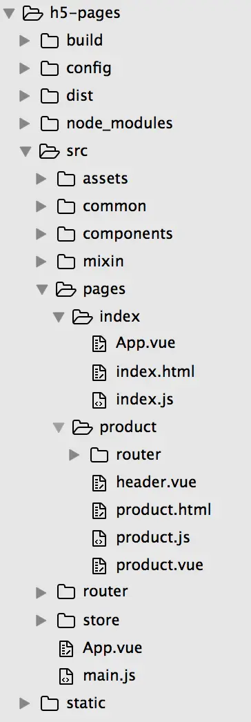 由于我是直接在原来单页面的框架上改的,所以main.js和App.vue还在最外层,如果是新的框架的话可以全都放到pages里