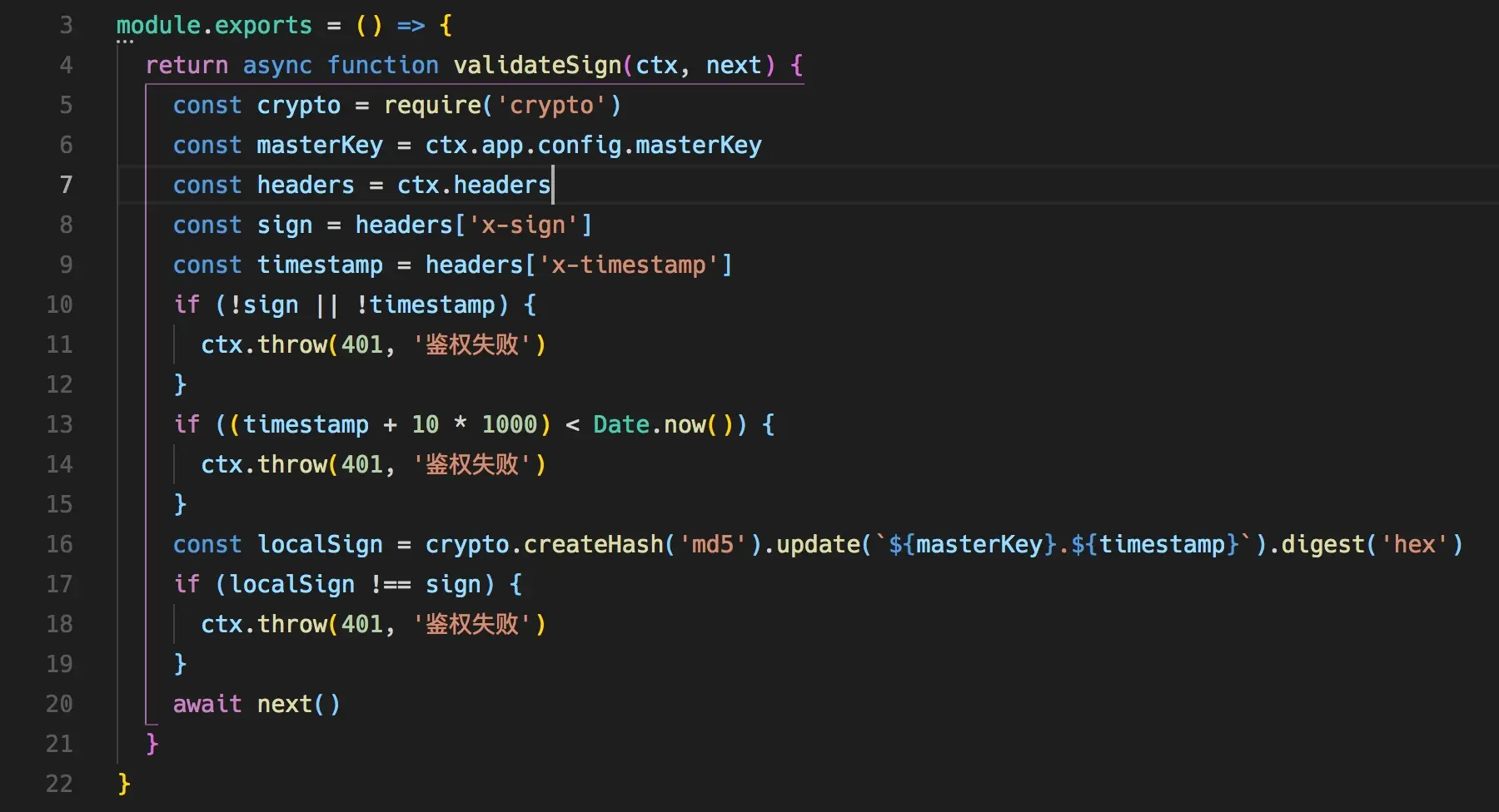 这里我们可以看到接口请求中需要包含x-sign和x-timestamp,签名规则为 MD5(${masterKey}.${timestamp}) 了解到接口验证规则后,我们可以继续往后走。