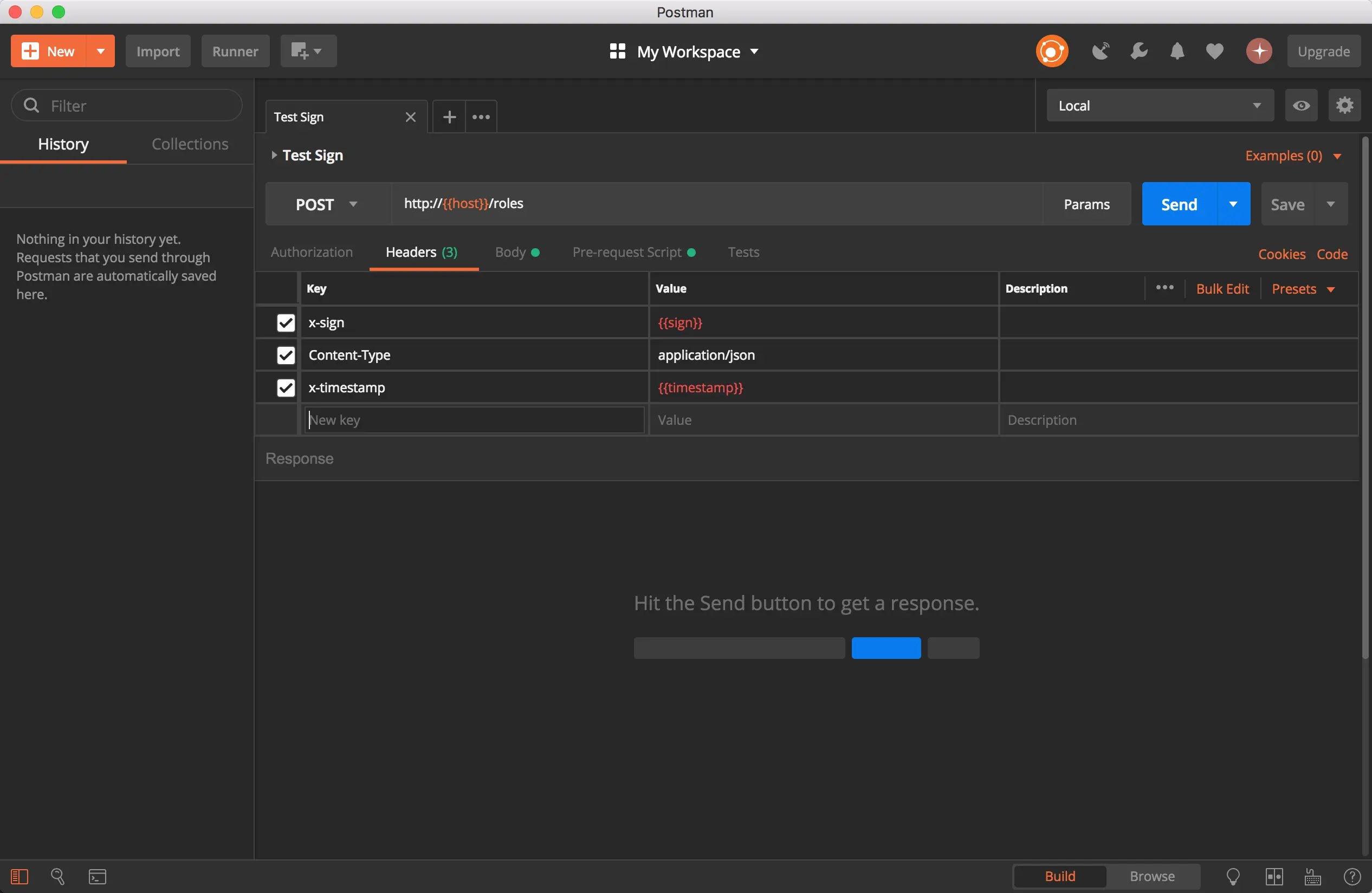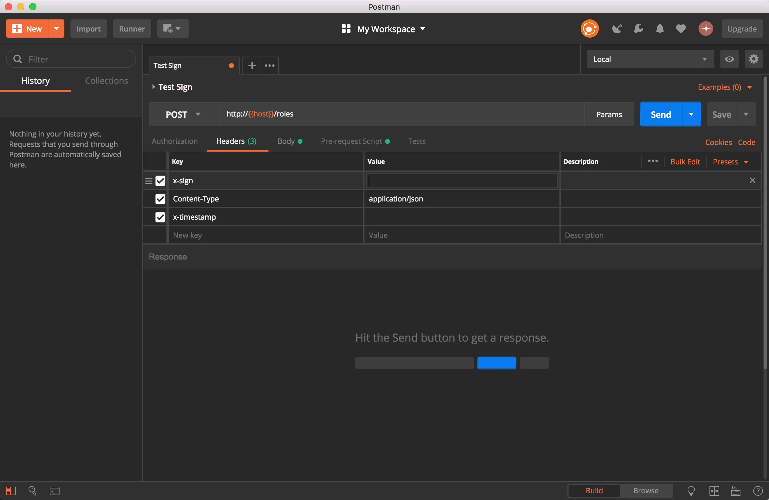 现在问题来了,正常情况下我们需要在Headers里面填写固定的内容。但是现在我们要填写的x-sign和x-timestamp是需要计算出来的。无法直接填写,怎么办?