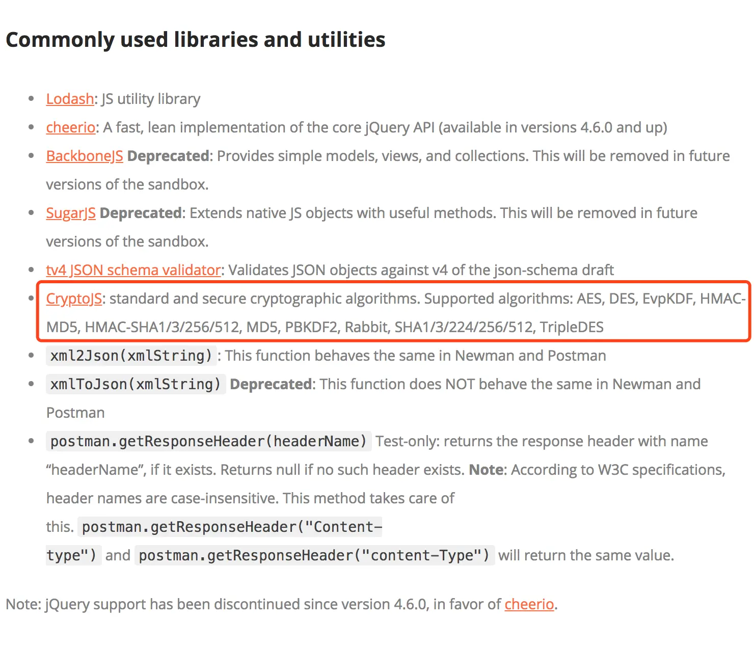 接着我们继续下一步。咦,计算MD5???JavaScript并没有提供现成的计算函数,怎么办?Postman早就考虑到了这点,所以内置了一系列常用的库:
