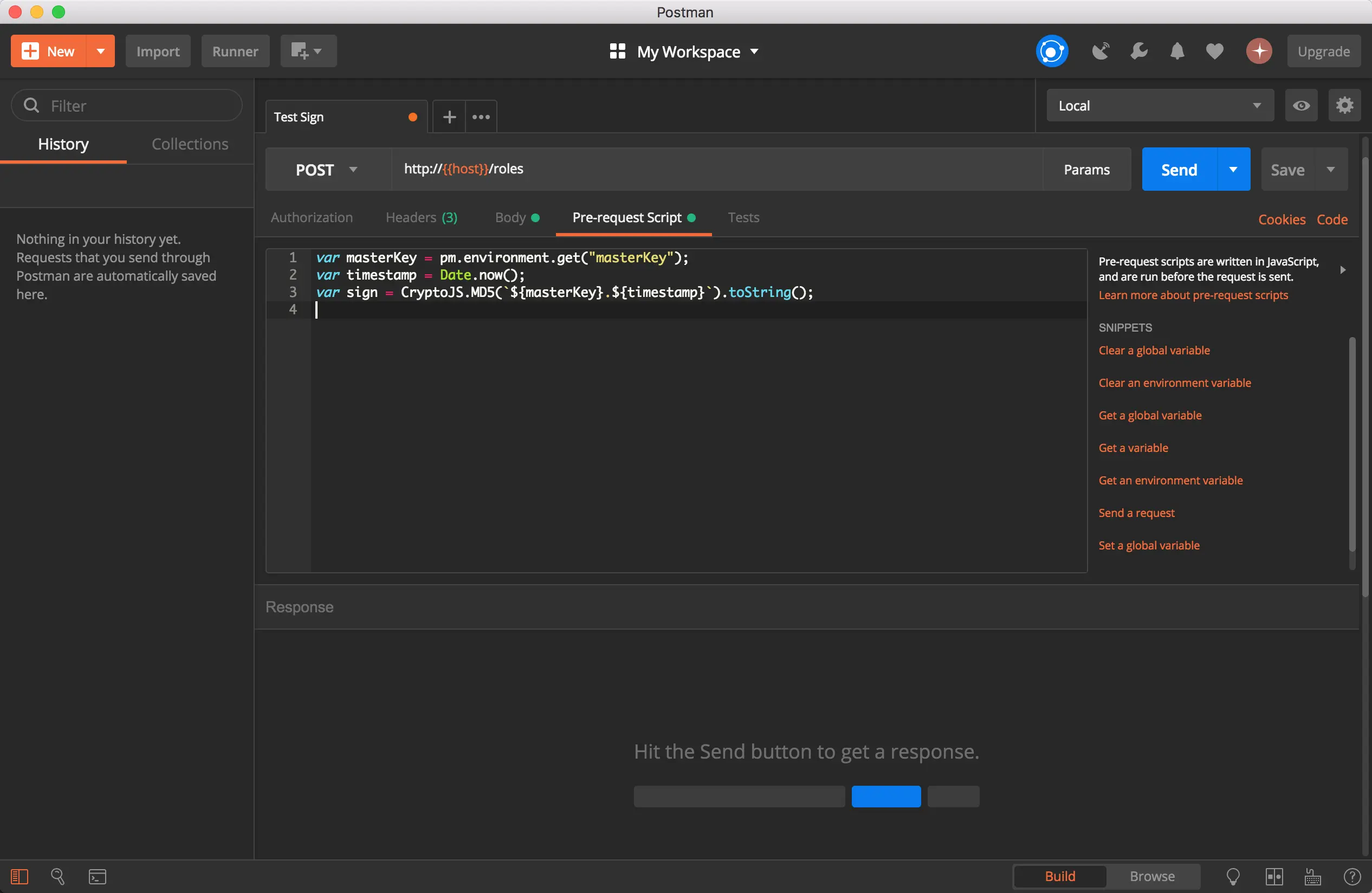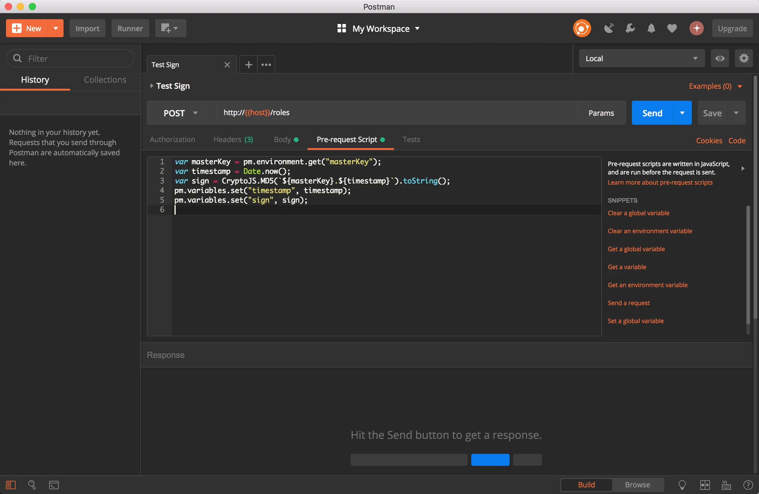 Postman每发起一个请求之前,都可以选择执行一段pre-request script。这恰恰给了我们机会在请求发起之前生成我们需要的数据。闲话少说,我们打开Postman中的pre-request script面板: