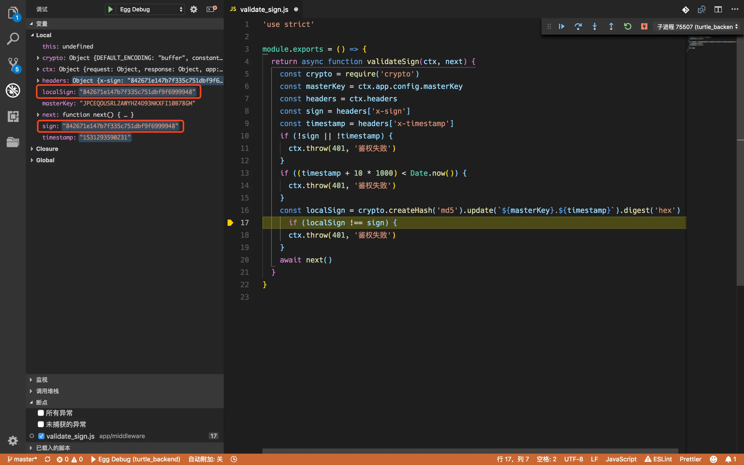 我们将写好的请求发出,并在服务端断点,看看是否能获取到x-sign和x-timestamp,并且对比计算出的sign是否一致: