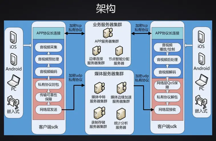 为了更直观的说明,架构图里展示的是单向流程。左侧是发送方,右侧是接收方。发送方的编解码进行音视频采集、音视频预处理,然后进行音视频的编码,随后进入网络层,在做完私有协议的封包、传输可靠性的保障以后,使用加密的udp私有协议作为传输层协议,将数据包发送到分配服务器根据智能算法分配的媒体服务器集群。通过边缘加速节点到达核心媒体中转服务器,媒体中转服务器负责将数据包转发给同一会话的其他用户。