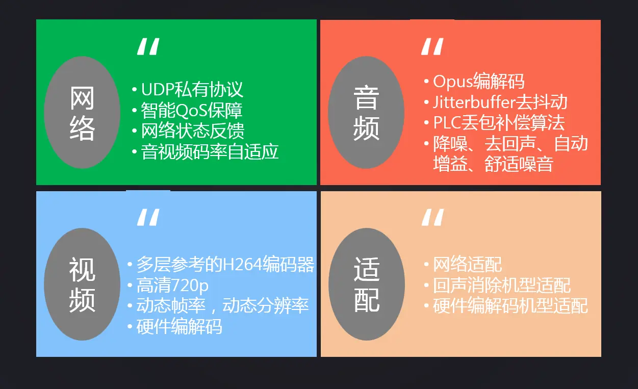 实现的这套实时音视频系统的几大技术要点,主要包括下面四个部分:网络、音频、视频和适配。