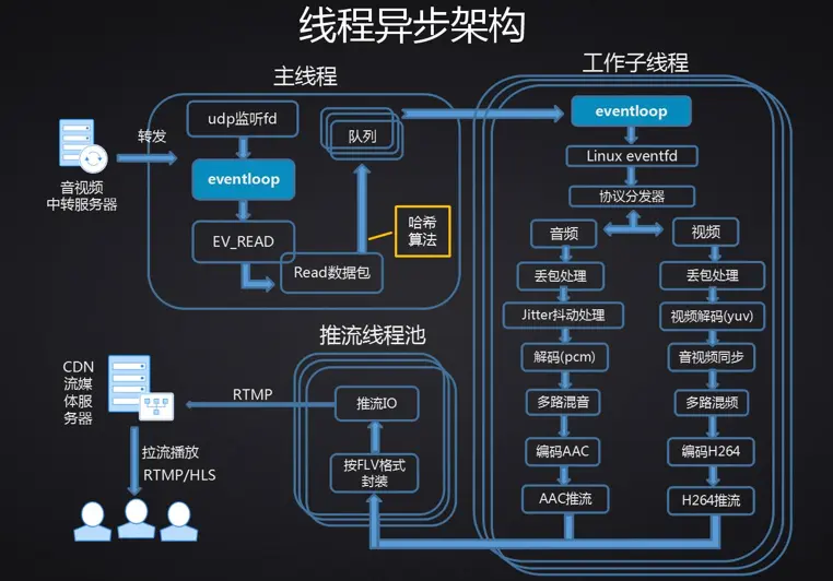 工作子线程从队列中依次取出数据包,对数据进行协议解包,进入协议分发器,进行业业务逻辑的拆分,对于音频数据进行丢包处理,然后会由jitterbuffer算法来平滑抖动并解码成pcm数据;对于视频会同样会进行丢包处理,然后进行视频解码成yuv数据,视频部分还会做一步和音频的同步操作。之后会进行每个房间的多路音频pcm数据的混音和多路视频yuv的混合。混音结束以后会将pcm数据再编码为aac然后调用aac推流,视频yuv数据编码为H264以后调用H264的推流。