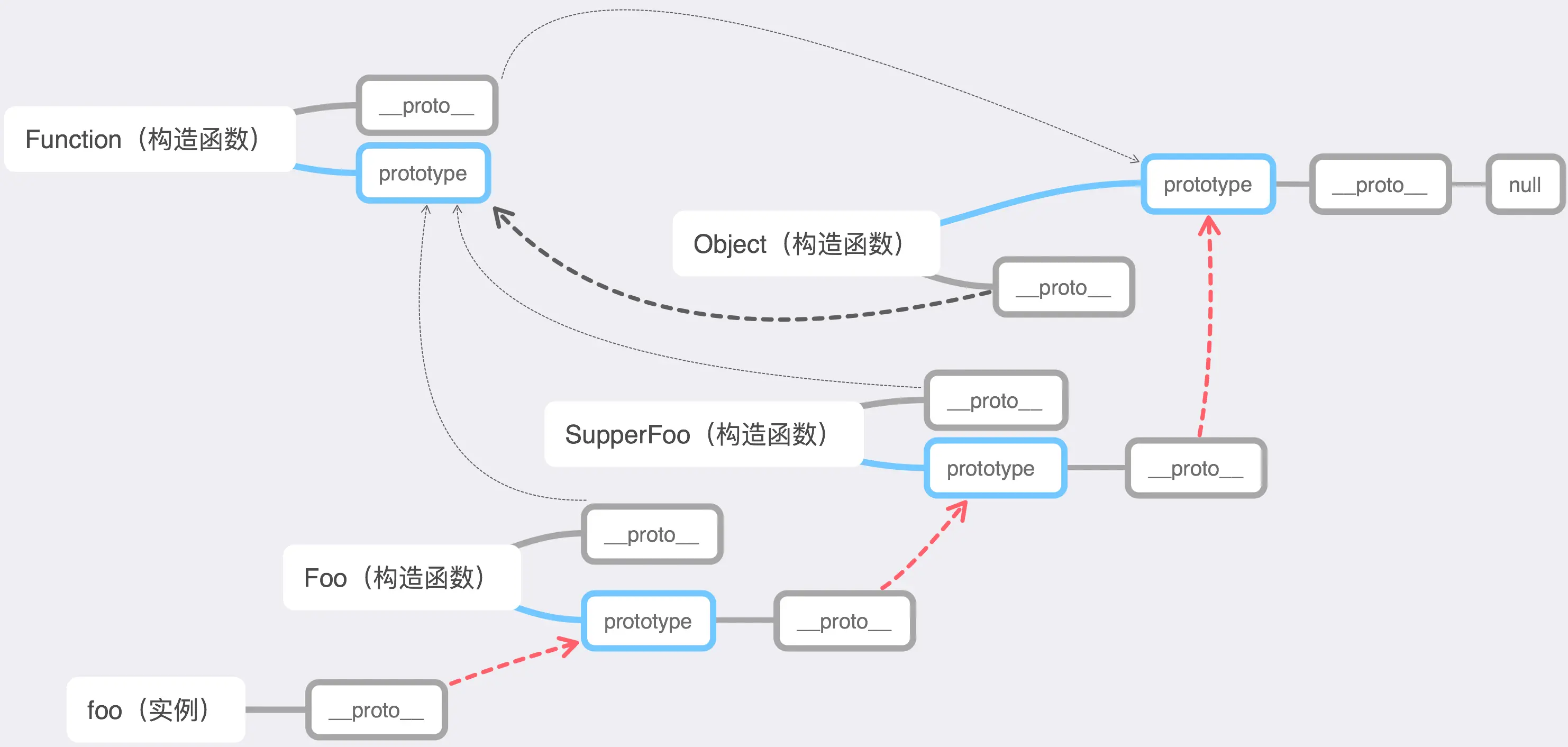 对象实例.__proto__ === 构造函数.prototype构造函数.prototype.__proto__ === 父构造函数.prototype(如果父构造函数又继承于其他函数,则关系类似,一直直到顶层构造函数)顶层构造函数.prototype.__proto__ === Object.prototypeObject.prototype.__proto__ === null