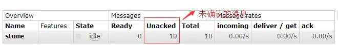 如果应用程序接收了消息,因为bug忘记确认接收的话,消息在队列的状态会从“Ready”变为“Unacked”,如图: