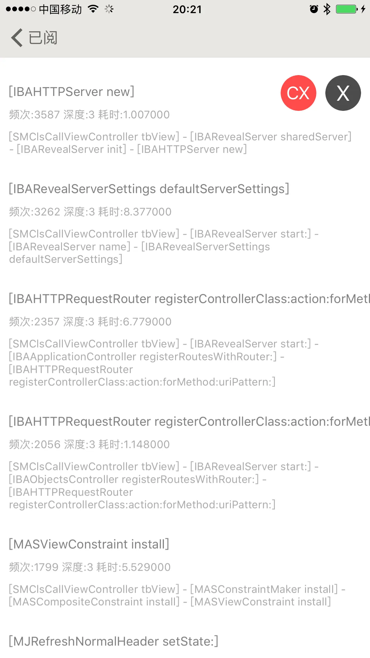 - 方法调用频次使用可以在需要开始统计的地方加上 [SMCallTrace startWithMaxDepth:3]; 记录时使用 [SMCallTrace stopSaveAndClean]; 记录到到数据库中同时清理内存的占用。可以 hook VC 的 viewWillAppear 和 viewWillDisappear,在 appear 时开始记录,在 disappear 时记录到数据库同时清理一次。结果展示的 view controller 是 SMClsCallViewController,push 出来就能够看到列表结果。