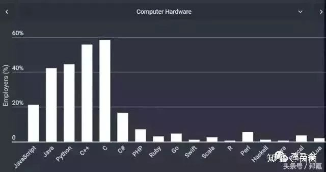 在计算机硬件行业,C语言最为操作系统时代的老大,当前在计算机硬件行业明显高于其他语言,在底层、中间件应用市场中C和C++两者差距微乎其微,C由于其性能,直接的低级硬件API以及跨多个平台的编译器的可用性而主导硬件。物联网依然离不开C语言。排行前三的分别为C、C++、Python