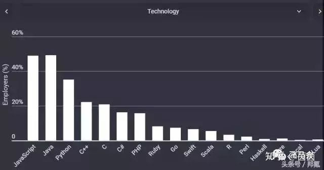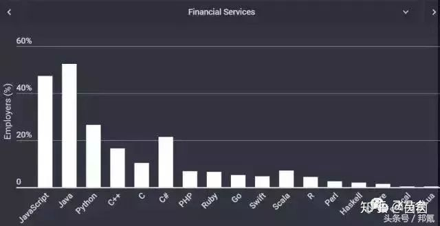 在金融服务行业,排行前三的分别为Java、JavaScript和Python,其中,Java在金融服务领域已经流行了很多年。