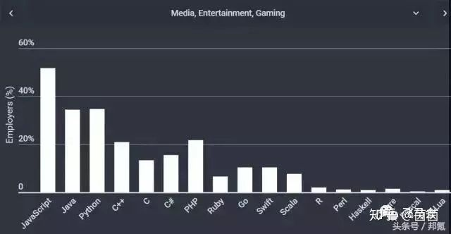 媒体/娱乐/游戏行业中,JavaScript排行第一,Java第二,Python第三,PHP第四