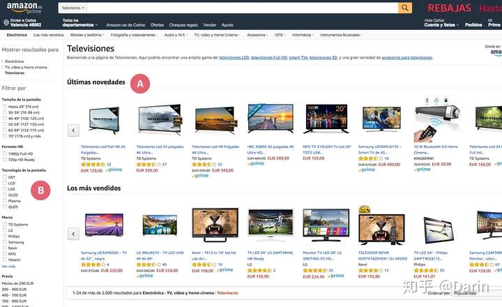B) 如果你想筛选,你将每种技术(LCD,LED等)放在一起,品牌之间存在分离(LG,三星等......)