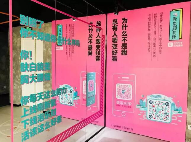比如,新氧和乐刻健身的合作快闪店,健身房被刷上粉蓝撞色的墙面,衬着落地镜上slogan更为醒目——“身材管理上乐刻,皮肤管理下新氧”,背后的逻辑是,乐刻健身的消费群体注重自我管理,对于美、健康有一定追求,与新氧用户群有大量重叠,新氧与乐刻健身将身体的美和颜值的美叠加来吸引线下的眼球,快闪之中能帮双方高效获得新的目标用户。
