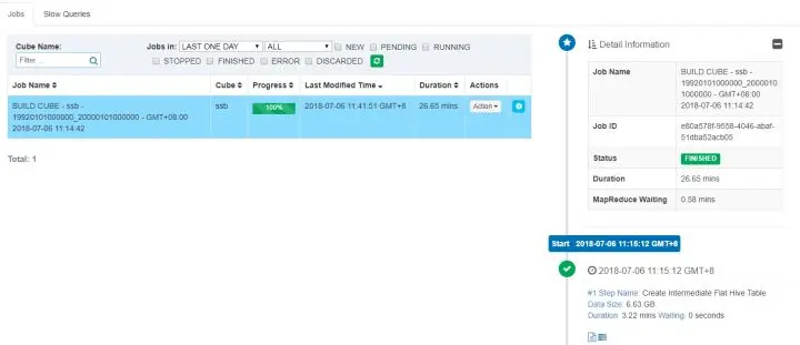 在执行Spark构建Cube之前,需要在Advanced Setting中设置Cube Engine值为Spark,然后执行Build。构建完成后结果如下: