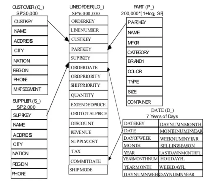 测试的过程会生成5张表,测试的数据量可以根据参数调整。SSB的表结构如下图所示: