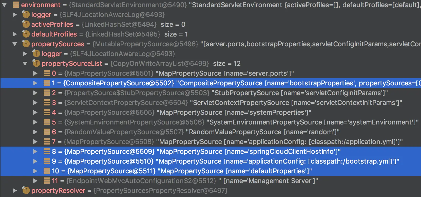这些是 Spring Cloud 添加的一些属性源。最重要的是列表中的第二个元素,名为 bootstrapProperties。Spring Cloud 引入了 PropertySourceLocator 的概念,该概念用于定位远程属性源。当您的应用程序启动时,这些远程属性源将被解析,然后将它们组合成一个 CompositePropertySource,并将其插入到环境的优先级列表的顶部,并使用名称 bootstrapProperties。这基本上意味着远程配置将覆盖您在应用程序中嵌入的任何配置,甚至是系统属性。