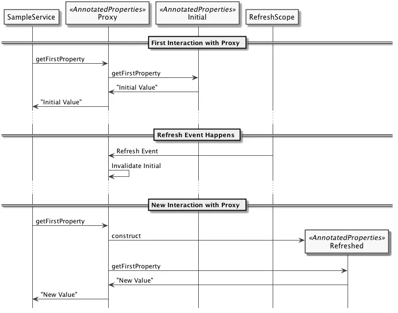 Spring Cloud 为定义称为 RefreshScope 的 bean 提供了一个新的范围。如果您声明一个具有此范围的@Bean,那么 Spring Cloud 将把该 bean 封装在一个代理类中,这是其他组件实际要注入的。这个代理将把组件的每个方法代理到真正的实现中。