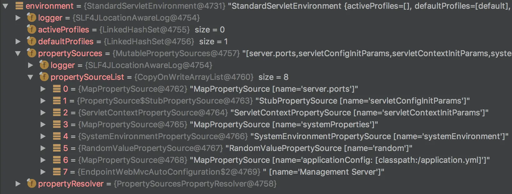 为了获得更直观的表示,当一个非常简单的 Spring Boot 应用程序启动时,您可以看到以下 Environment 对象的屏幕截图: