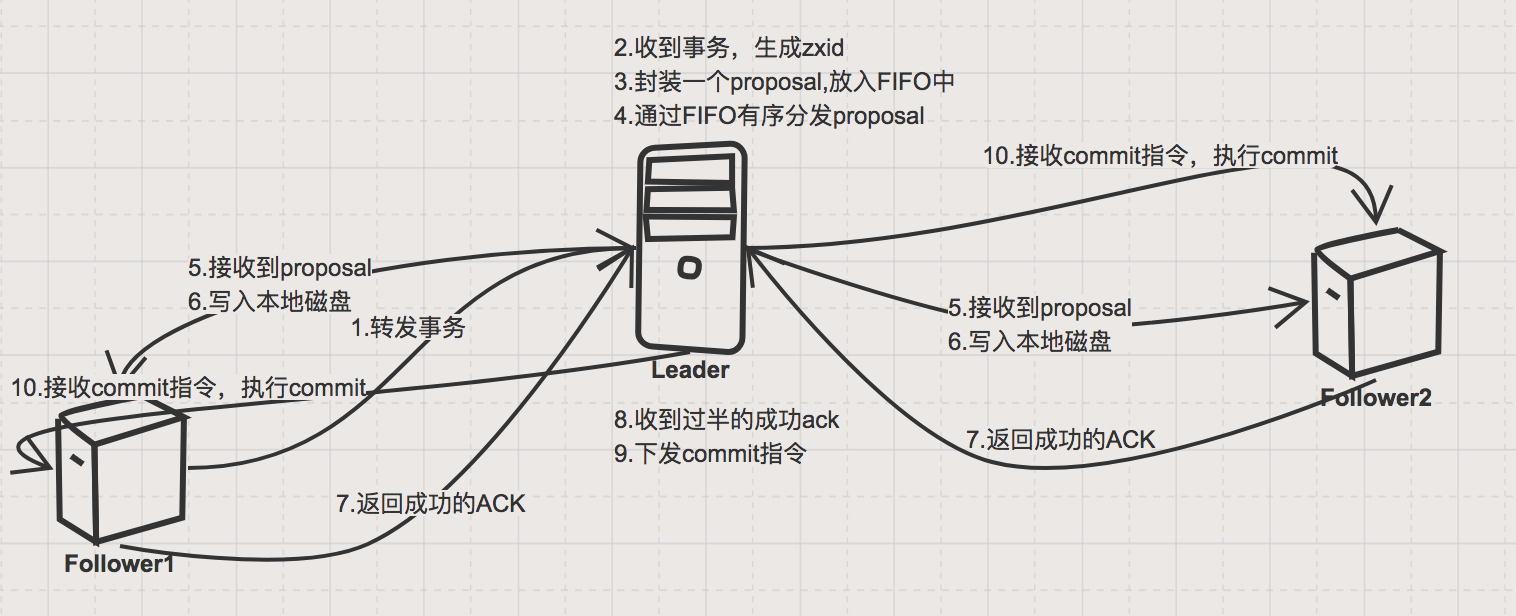 ZooKeeper的原子广播实际上是基于一个简化版的2PC提交过程,熟悉分布式事务的应该了解2PC,我这里就不详细介绍什么是2PC了,等哪天我可能会心血来潮写一篇分布式事务相关的文章时,再好好介绍什么是2PC什么是3PC吧~