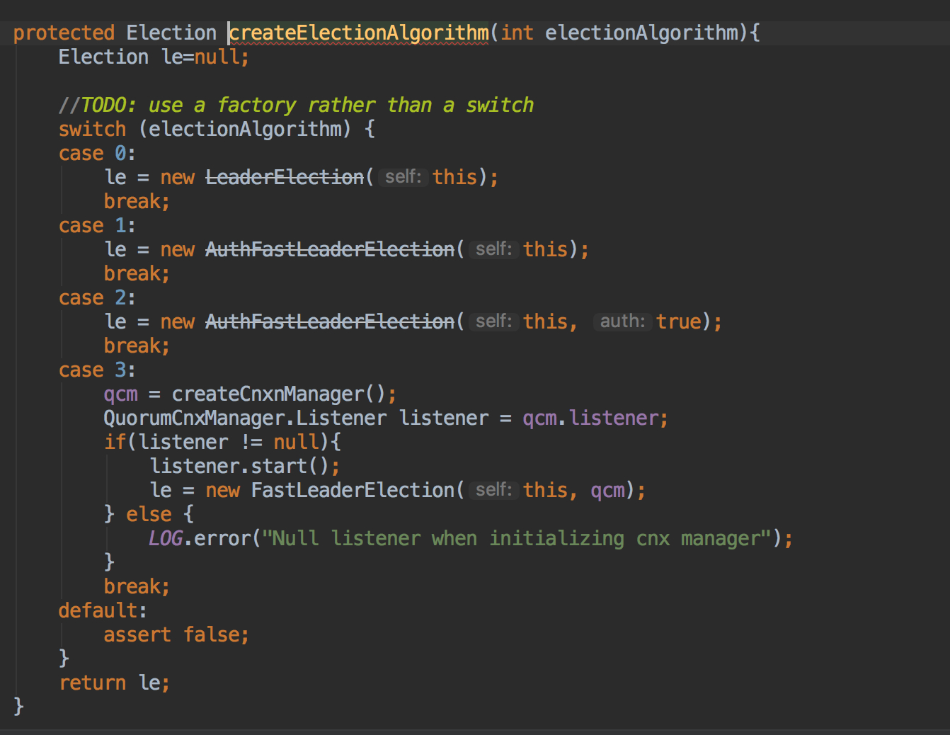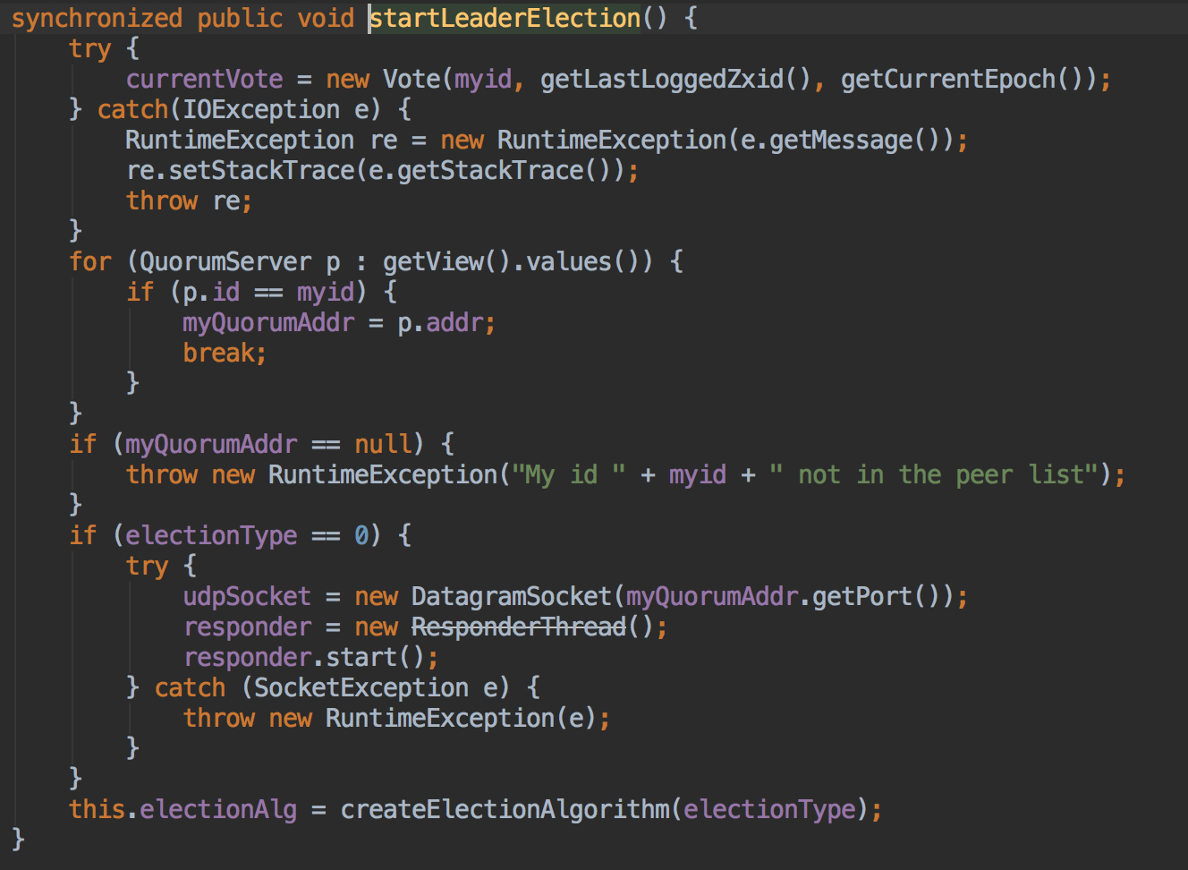 默认从config中读取出的是3,可以在runFromConfig中看到相关配置,首先创建了一个QuorumCnxManager的实例,该类主要负责Leader选举的IO,然后启动已绑定端口的选举监听现场,等待其他机器进行连接,然后创建一个FastLeaderElection实例