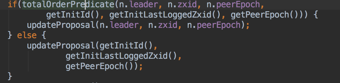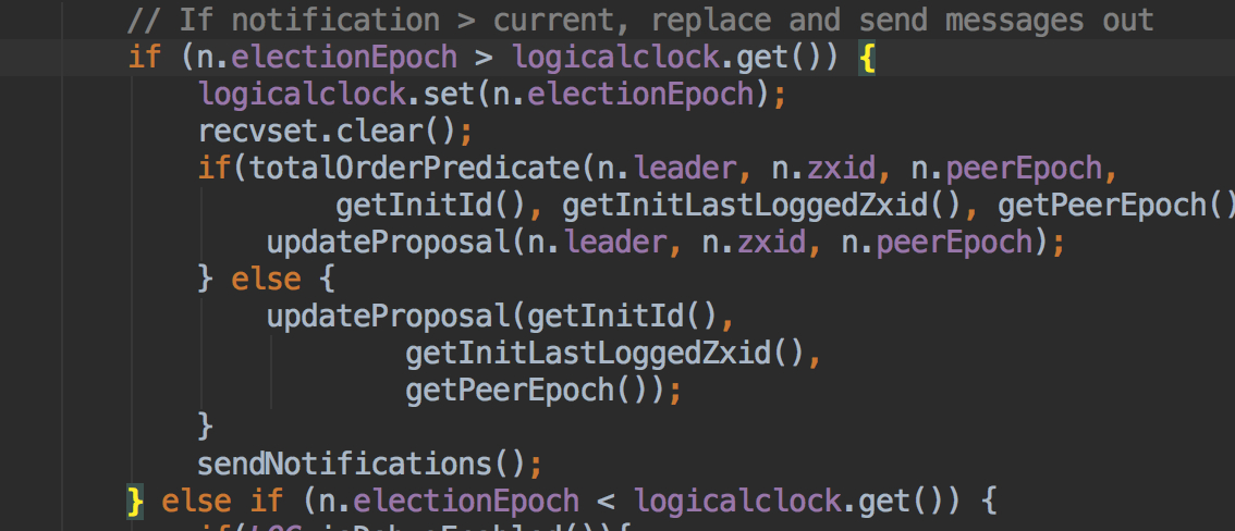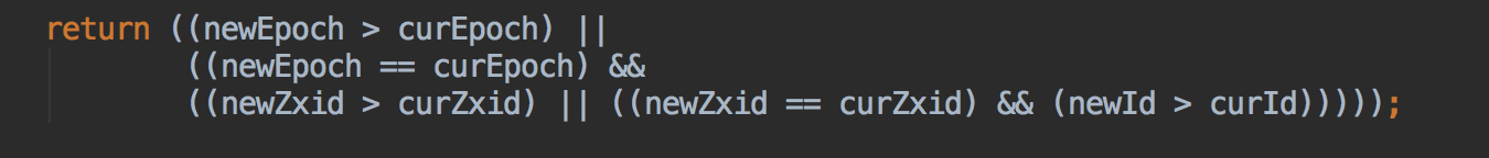 先判断epoch是不是比当前的大,如果是比当前的大,那么我这个就是旧的,因为每一轮选举后都会epoch+1那么则是对方的大,那么对方胜出,对方是leader,如果epoch相等那么就判断zxid,如果对方的zxid大,那么对方胜出对方是leader,如果 epoch和zxid都相等,那么就判断myid,谁大谁胜出谁是它认可的Leader