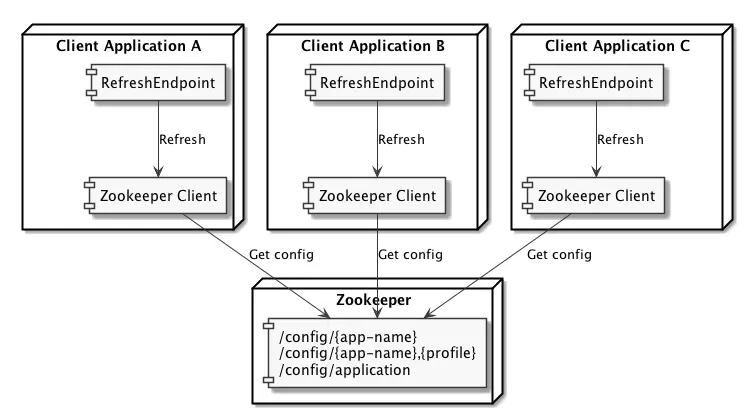 Spring Cloud Config将向你的应用程序添加一个ZokeeperPropertySource,该应用程序将使用Curator与Zookeeper通信。然后,只需设置Zookeeper集群,并告诉应用程序它位于何处。