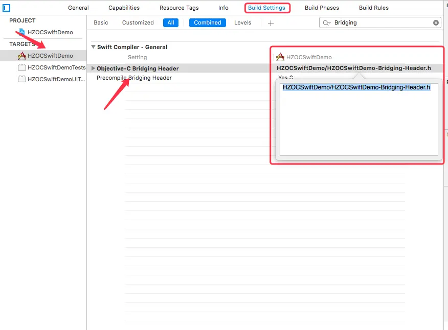 ps: 桥接头文件的格式:项目名-Bridging-Header