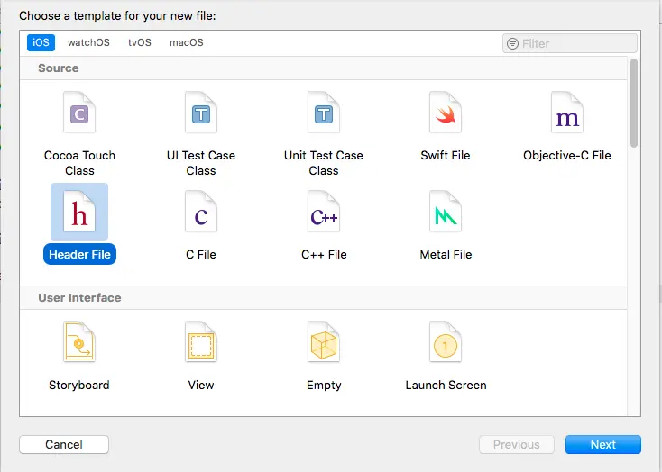 a.创建桥接头文件(也可以在创建OC类的时候,会有弹出一个创建选项,选择创建)。