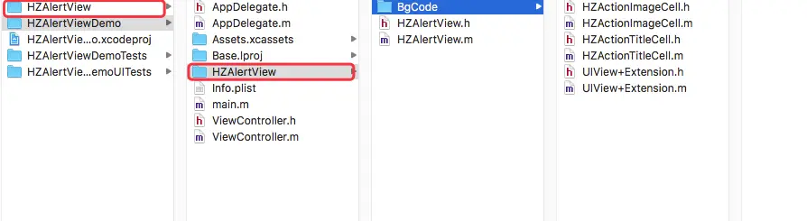 第二步:把自己写好的组件封装好(一般是统一放进一个文件夹里),大概结构如此:例如HZAlertView这个组件,分别放在项目外和项目里,并且保持两个文件夹里的内容一致。外面的是用来使用者下载的,里面的是项目里使用的。