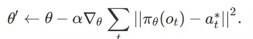 首先,我们收集了一个包含大量遥控机器人执行不同任务的演示数据集,在我们的例子中,这对应于操纵不同的对象。然后,我们运用 MAML 来学习一组初始策略参数 θ,以便在为某个对象提供演示之后,我们可以对演示进行梯度下降,以找到一个针对该对象参数 θ' 的可泛化策略。在使用遥控演示时,可以通过比较策略的预测行动 π_θ(o_t)和演示行动 a*_t 来计算更新策略: