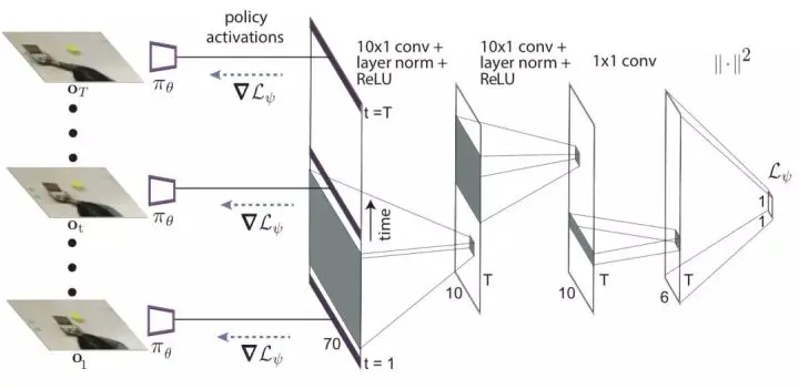 虽然这看起来像是一个不可能完成的任务,但请记住,元训练过程在梯度步之后仍然通过真正的机器人动作来监督策略。因此学习损失的作用可能被解释为简单地引导参数更新来修改策略以拾取场景中正确的视觉线索,使得元训练的输出为正确的动作。我们使用时间卷积来学习损失函数,它可以在视频演示中提取时间信息: