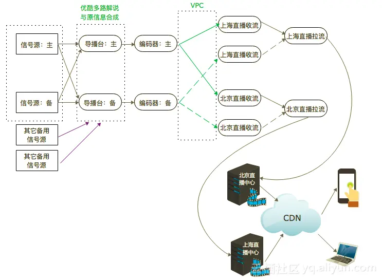 世界杯比赛的信号源是直播的根本,信号的稳定性直接影响所有直播用户的观看体验,所以必须做多信号源的备份,阿里云采取了以下方案: