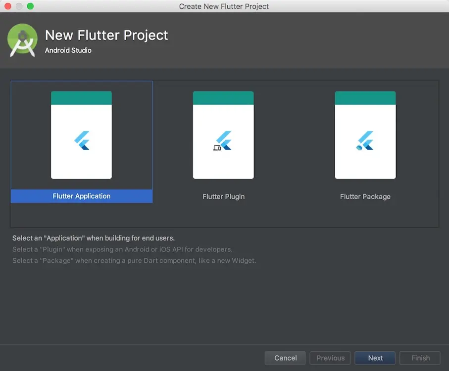 在Android Studio中,依次选择File->New Flutter Project-> Flutter application,然后填写相关信息点击“Next”,最后点击“Finish”。如下图: