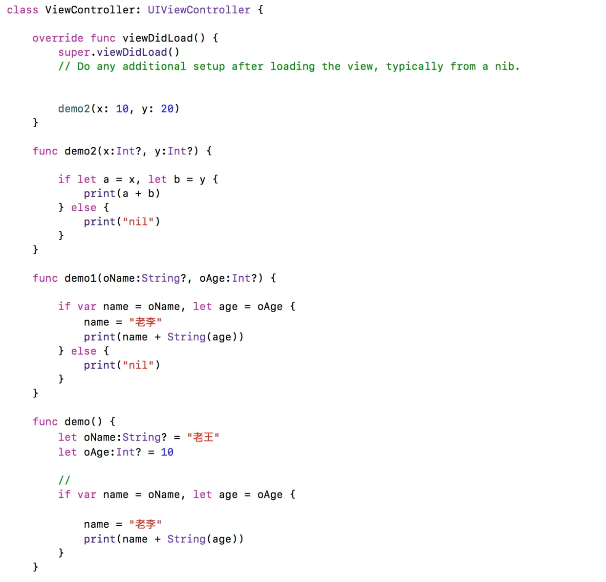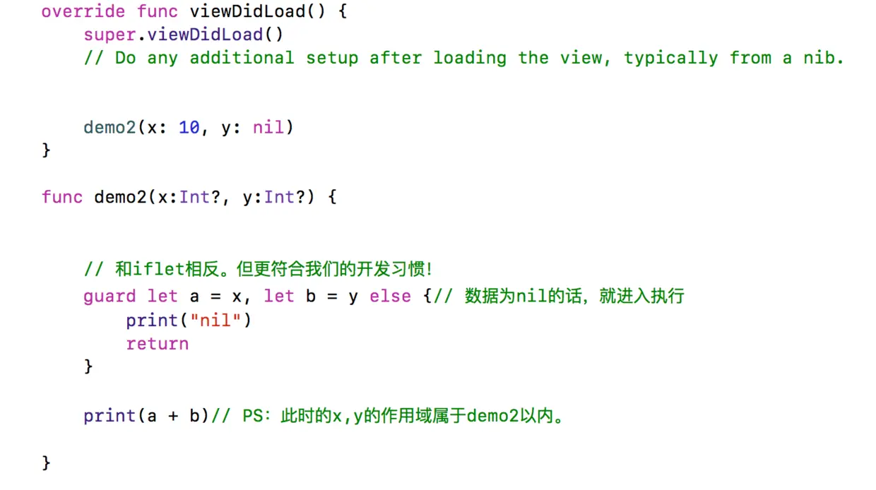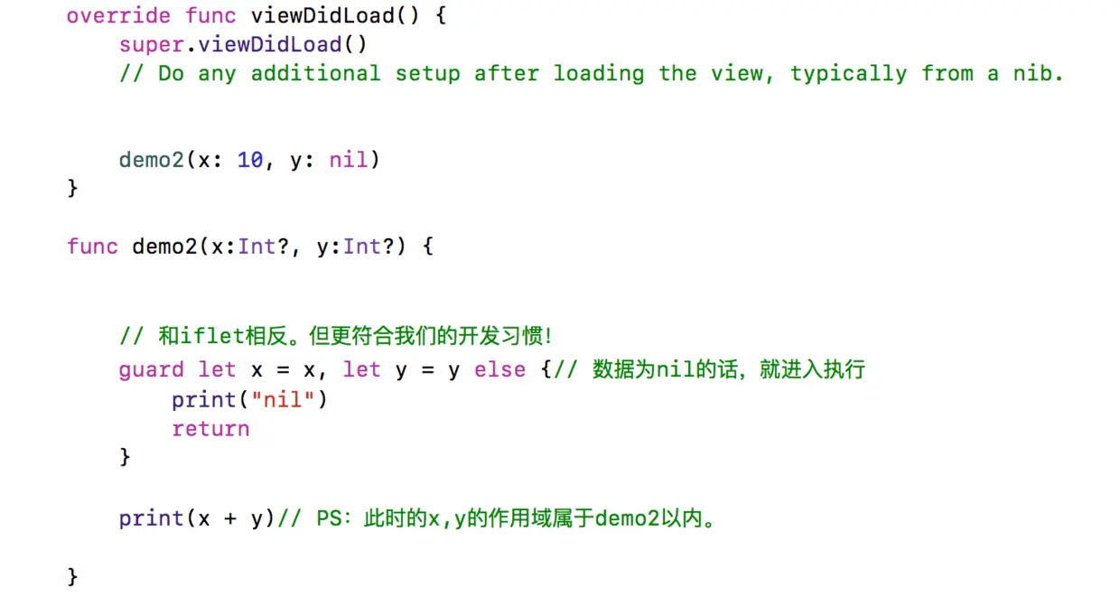 最后:为了更为符合我们的开发习惯,swift推出了guardlet,它和iflet一样,但是结构上刚好相反。一是进入执行的变量有一个为nil,二是不是nil的时候的变量的作用域更大一层。