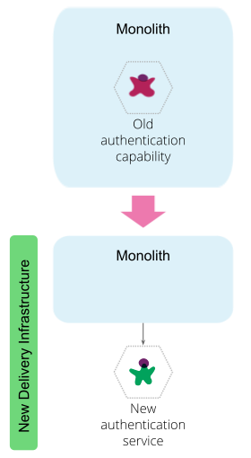 Let me illustrate this point with an example. Imagine the microservice architecture goal is to increase the speed of developers modifying the overall system to deliver value. The team decides to decouple the end user authentication into a separate service based on OAuth 2.0 protocol. This service is intended to both replace how the existing (old architecture) client application authenticates the end user, as well as new architecture microservices validate the end user. Let's call this increment in the evolution, ‘Auth service introduction’. One way to introduce the new service is to go through these steps first:
