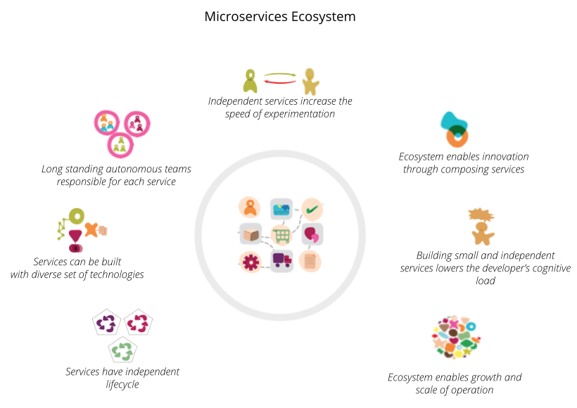 Before embarking, it is critical that everyone has a common understanding of a microservices ecosystem. Microservices ecosystem is a platform of services each encapsulating a business capability. A business capability represents what a business does in a particular domain to fulfill its objectives and responsibilities. Each microservice expose an API that developers can discover and use in a self-serve manner. Microservices have independent lifecycle. Developers can build, test and release each microservice independently. The microservices ecosystem enforces an organizational structure of autonomous long standing teams, each responsible for one or multiple services. Contrary to general perception and ‘micro’ in microservices, the size of each service matters least and may vary depending on the operational maturity of the organization. As Martin Fowler puts it, "microservices is a label and not the description".