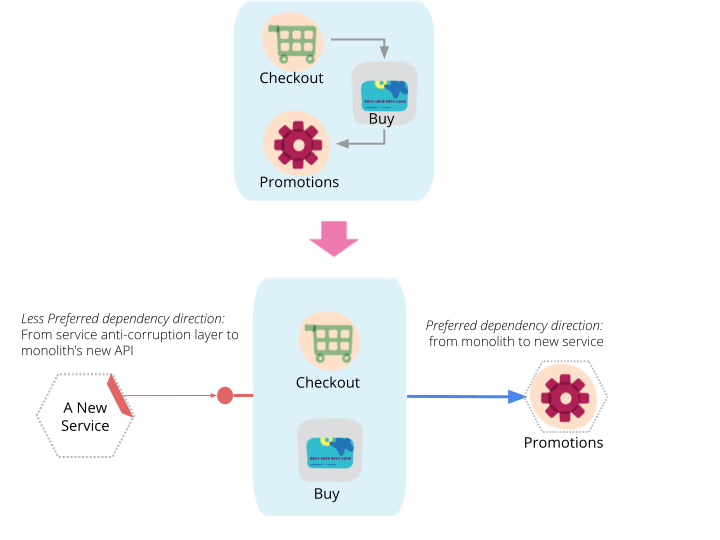 Consider in a retail online system, where ‘buy’ and ‘promotions’ are core capabilities. ‘buy’ uses ‘promotions’ during the checkout process to offer the customers the best promotions that they qualify for, given the items they are buying. If we need to decide which of these two capabilities to decouple next, I suggest to start with decoupling ‘promotions’ first and then 'buy'. Because in this order we reduce the dependencies back to the monolith. In this order ‘buy’ first remains locked in the monolith with a dependency out to the new ‘promotions’ microservice.