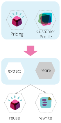 This capability is arguably a good candidate for reuse and extraction. In contrast, ‘customer profile’ is a simple CRUD capability that is mostly composed of boilerplate code for serialization, handling storage and configuration, hence, it is a good candidate for rewrite and retire.