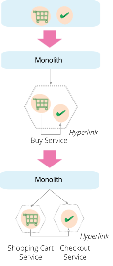 For example, on the journey decoupling the retail system, developers may start with one service ‘buy’ that encapsulates both the content of a ‘shopping bag’ as well as capability of buying the shopping bag, i.e ‘check out’. As their ability to form smaller teams and release larger number of services grows then they can decouple ‘shopping bag’ from ‘check out’ into a separate service.
