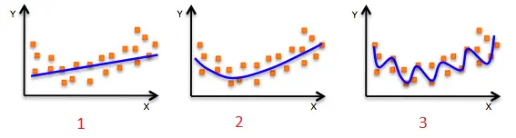 解析:1、2、3 模型分别对应的多项式阶数由小到大,即模型由简单到复杂。模型越简单,容易发生欠拟合;模型越复杂,容易发生过拟合。第 1 个模型过于简单,出现欠拟合;第 3 个模型过于复杂,对训练样本拟合得很好,但在测试样本上效果会很差,即过拟合;第 2 个模型最为“健壮”,在训练样本和测试样本上拟合效果都不错!