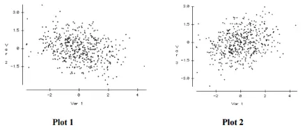 解析:显然,Plot 2 显示出 Var2 与 Var1 是正相关的,例如 Var2 = Var1。Plot 1 显示出 Var2 与 Var1 是负相关的,例如 Var2 = -Var1。