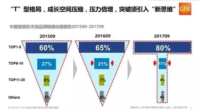智能手机的“T型格局”正在上演新一轮的马太效应。根据全球市场研究机构GfK的全国手机零售监测数据显示,过去三年来,销量份额愈发向“T”字的几家头部厂商集结,第二、三、四梯队的生存空间进一步受到压缩。
