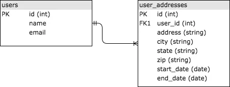 SQL stands for “Structured Query Language” and was invented in the 1970s to provide a standard way of querying relational data sets that was accessible to a wide audience. SQL databases store data in tables that are linked together via common IDs, typically integers. Let’s walk through a simple example of storing historical address information for users. You might have two tables, users and user_addresses, linked together by the user’s id. See the image below for a simplistic version. The tables are linked because the user_id column in user_addresses is a “foreign key” to the id column in the users table.