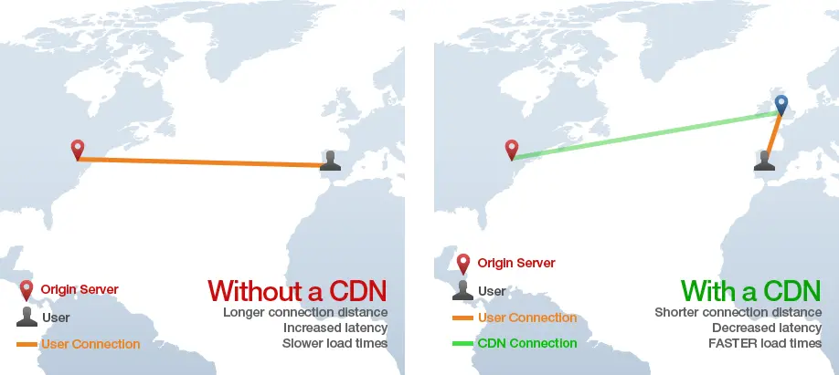 CDN stands for “Content Delivery Network” and the technology provides a way of serving assets such as static HTML, CSS, Javascript, and images over the web much faster than serving them from a single origin server. It works by distributing the content across many “edge” servers around the world so that users end up downloading assets from the “edge” servers instead of the origin server. For instance in the image below, a user in Spain requests a web page from a site with origin servers in NYC, but the static assets for the page are loaded from a CDN “edge” server in England, preventing many slow cross-Atlantic HTTP requests.
