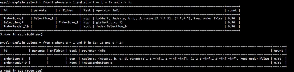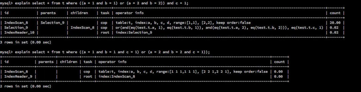 ((a = 1 and b = 1) or (a = 2 and b = 2)) and c = 1形式的式子,前段 OR 表达式实际上为点查的行为,但是由于是 OR 连接起来的式子,所以在 TiDB 的逻辑中作为范围查询处理,因此c = 1不会作为索引的计算条件处理。而这时改写为(a, b) in ((1, 1),(2, 2)) and c = 1的形式也不会使c = 1选入索引计算的条件,原因是多列 in 的函数会被 TiDB 改写为 OR 连接的形式,所以((a = 1 and b = 1) or (a = 2 and b = 2))和(a, b) in ((1, 1), (2, 2))在 TiDB 中是完全一致的行为。针对这种情况,目前的办法只有将这些条件都放入 OR 的子项中,针对这里用到的例子,那就是要改写为((a = 1 and b = 1 and c = 1) or (a = 2 and b = 2 and c = 1))。