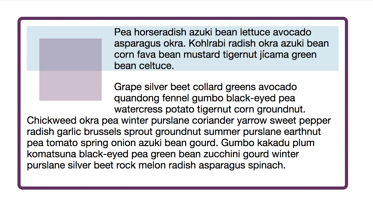 如果希望元素在浮动元素之后开始排列,那么上面的代码可以达到你的需求。如果你发现在容器内有一个浮动元素,同时容器内文本内容过短时,就会出现问题。文本盒子会被绘制在浮动元素下,然后接下来的部分会以正常流方式绘制在其后。
